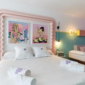 Located 1.2 mi from Ocean Beach Ibiza, Paradiso Ibiza Art Hotel - Adults Only offers two outdoor pool, an Art Gallery inside the property and free WiFi. There is free private parking on site. Featuring bright 70's-style furniture, Each room is named after an international contemporary artist and feature an original work of art donated by the artist. Each room comes with a Smeg fridge and Marshall speakers. They all include a balcony, air conditioning, and a private bathroom. Pool towels are provided. A buffet breakfast can be enjoyed in the breakfast area located by the pink pool. Paradiso Ibiza Art Hotel - Adults Only also features a tattoo studio and many more surprises. Ibiza Airport is 8.1 mi from the accommodations and a 25-minute drive will take you to Ibiza Town. When you book at this hotel you will have free access to the pool areas of the other Concept Hotel Group hotels.